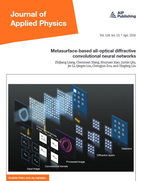 我院成像与视觉表示研究团队在全光神经网络与超表面光子学交叉领域取得进展,研究成果以“Metasurface-based all-optical diffractiveconvolutional neural networks”为题,近日正式发表于国际应用物理权威期刊 Journal of Applied Physics,并被选为期刊封面文章。